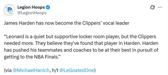 在2023-2024赛季后不久被交易到快船队时,哈登并没有被赋予领导球队的任务。然而,本赛季他是球队的领导者。