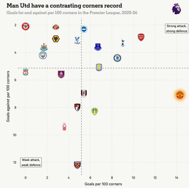 曼联的定位球水平行不行?凭印象,你很可能得出“防守很差”的结论,这也是事实。但要是论进攻,红魔却正在成为英超的“角球之王”。上周末绝平热刺,曼联就是靠德利赫特顶进角球,而论数据,他们在某种意义上甚至强于阿森纳。据竞技网计算,曼联本赛季虽然实际角球破门数低于阿森纳、切尔西,获得角球的次数也偏低,但他们“每100次角球平均进球数”是14.3,位列全联盟第一,而“每100次角球的预期进球值”也达到了7.1,在整个英超可排第二。